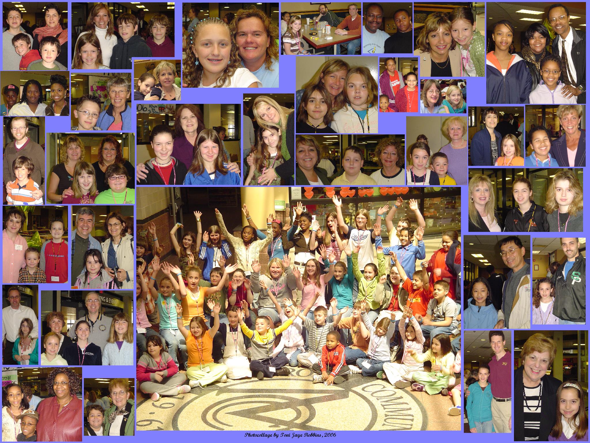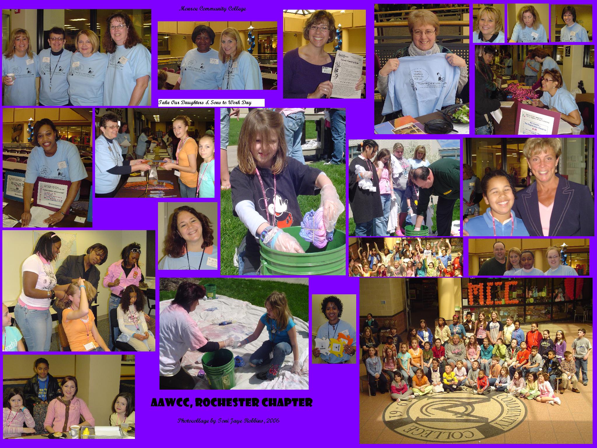 The photo collages attached to today’s article show many groups of parents and kids on Take Our Daughters & Sons to Work Day, April 27, 2006, sponsored by the American Association of Women in Community College. There’s also a collage showing many of the volunteers who helped make this a success.