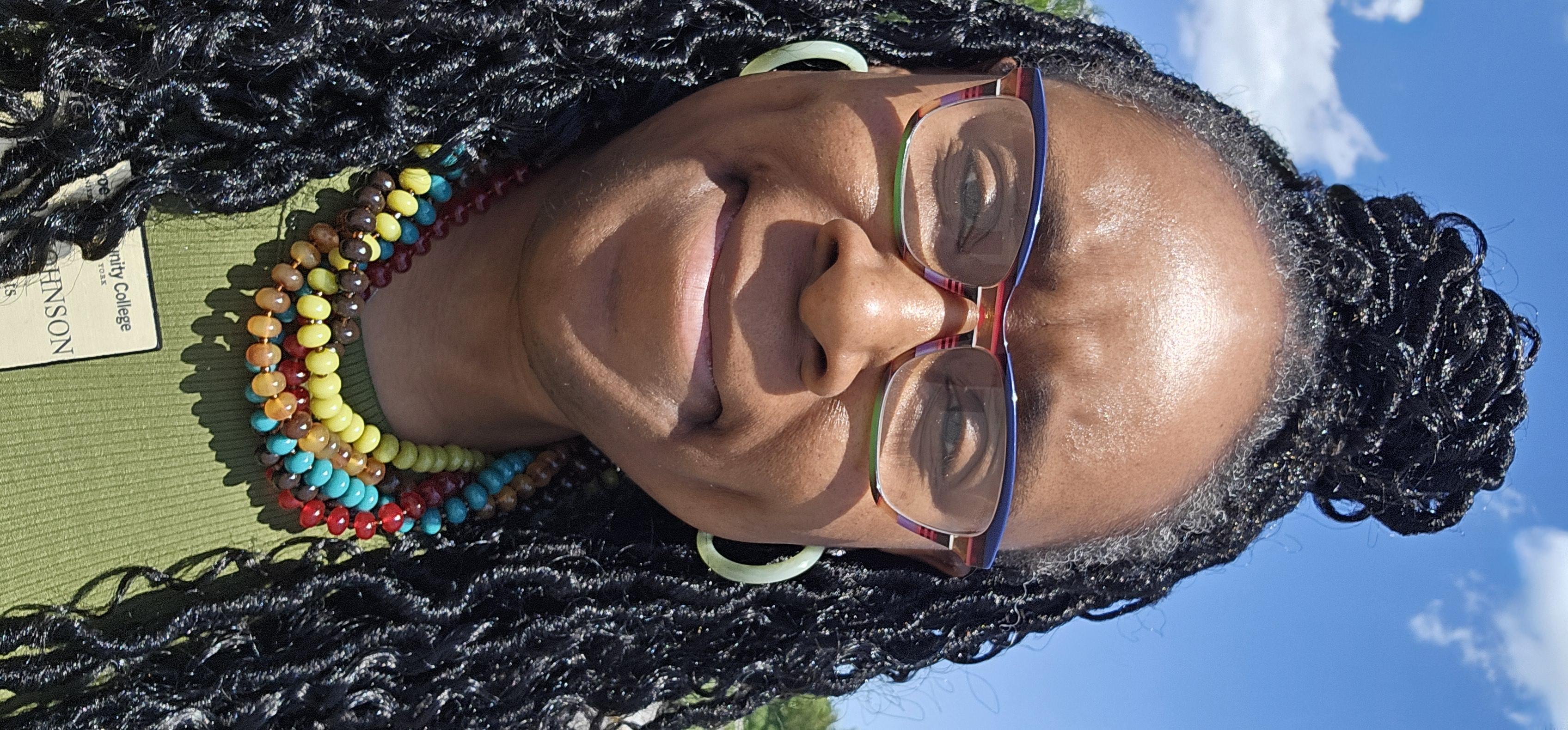 Photo Caption: Yolanda Johnson standing outside on a sunny day with a green shirt and colorful jewelry.