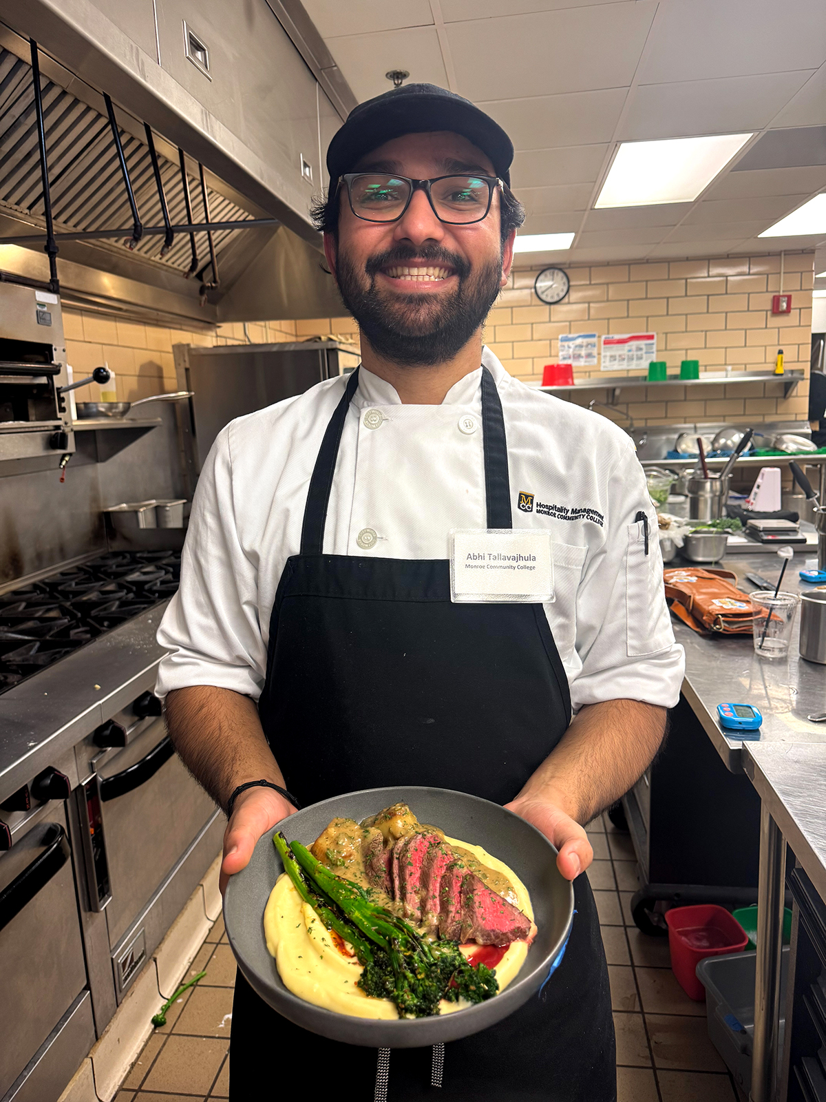 Abhinav is shown in the MCC culinary laboratory kitchen wearing his MCC's chef uniform of white jacket, black apron, and black hat. He is holding his award-winning dish (described above) in his hand and smiling directly into the camera.