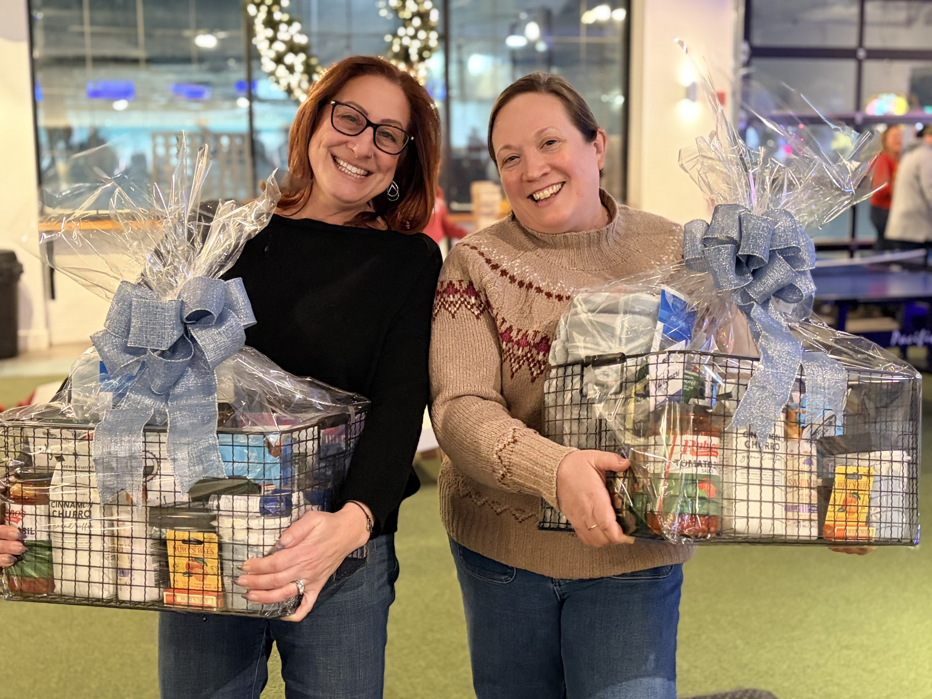 Photo caption: Susan Bender and Jennifer Kinslow looking at the camera and smiling while holding gift baskets.