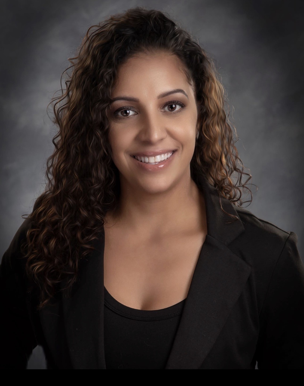 Image Caption: Professional headshot of Michelle Genao wearing a black shirt and blazer on a dark gray background.